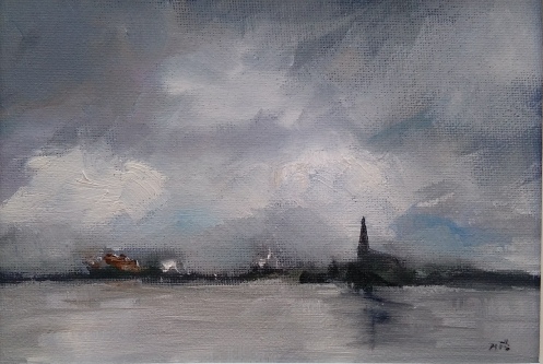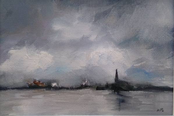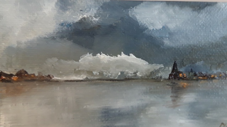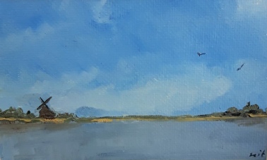 In haar landschap schilderijen is vooral veel ruimte blauwgrijs, als licht en als kleur, waardoor haar schilderijen een boeiend karakter krijgen